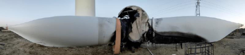 25日02:00,風(fēng)電機(jī)組機(jī)艙明火熄滅,經(jīng)初步觀察發(fā)現(xiàn):風(fēng)電機(jī)組機(jī)艙外殼全部燒損,輪轂罩大部分燒損,機(jī)艙控制柜、齒輪箱、發(fā)電機(jī)、主軸以及其它輔助設(shè)備大面積過火,三支葉片中一支葉片葉根及后緣燒損,另外兩支葉片葉根處輕微過火,塔基下風(fēng)向有部分散落的燃燒物及灰燼等。