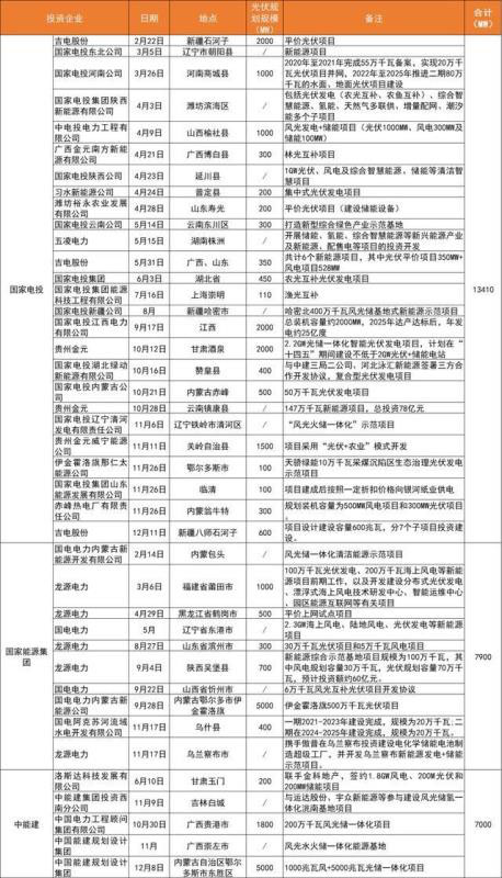 值得注意的是,這些項(xiàng)目多為“風(fēng)光+儲能”項(xiàng)目配置且容量較大,而項(xiàng)目投資企業(yè)大多涉及國家電投、中能建、國家能源集團(tuán)、中廣核、中核、三峽等家央企/國企。