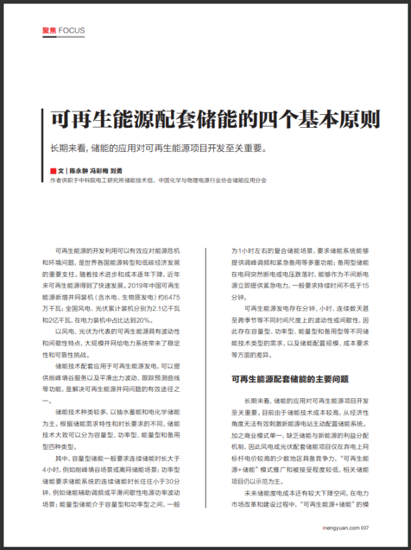 2020年以來,我國已有江西、湖南、新疆等10多個省份相繼出臺可再生能源配套儲能的相關(guān)政策。政策的引導(dǎo)和支持有助于促進(jìn)儲能產(chǎn)業(yè)的發(fā)展,但相關(guān)配置原則仍需探討。結(jié)合目前我國可再生能源開發(fā)和儲能技術(shù)發(fā)展的實際情況,可再生能源配套儲能可能需要遵循以下基本原則: