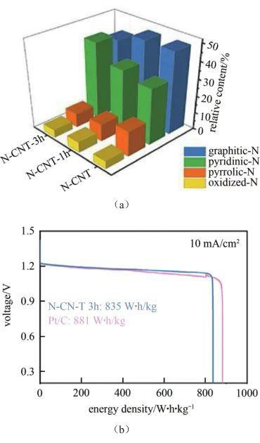 Yang等通過熱解三聚氰胺和L-半胱氨酸混合物,控制碳化溫度,制備出了高活性的氮摻雜三維石墨烯納米帶網(wǎng)絡(N-GRW),在鋅空氣電池中的開路電壓為1.46 V,峰值功率密度和比容量分別為65 mW/cm2和873 mA·h/g,具有良好的循環(huán)穩(wěn)定性,分析認為吡啶氮結構起主要催化作用。為了提高吡啶氮的含量,Yi等利用高錳酸鉀刻蝕空心管型聚吡咯制備了氮摻雜碳納米管,通過刻蝕碳材料引入了豐富孔結構和缺陷,使得更多N原子處在邊緣位置,吡啶氮的含量由32.8%提升到了45.2%[圖1(a)],該催化劑在堿性條件下具有優(yōu)于商業(yè)Pt/C的半波電位(0.83 V)和穩(wěn)定性,應用于鋅空氣電池中,顯示出122 mW/cm2的峰值功率密度和835 W·h/kg的能量密度[圖1(b)],與商業(yè)Pt/C近似。