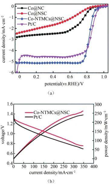 過渡金屬本身具有高催化活性,但抗氧化性能差。研究發(fā)現(xiàn),過渡金屬顆粒和碳材料復合作為ORR和OER雙功能催化劑表現(xiàn)出強的催化性能。在這種復合結構中,過渡金屬可以增加碳化過程中碳材料的石墨化程度,包裹在表面的碳材料可以有效的防止金屬團聚以確保分散,同時可以促進電子的轉(zhuǎn)移。Zhu等通過功能聚合物的可控自組裝制備了鈷摻雜含氮和硫的多孔碳球(Co-NTMCs@NSC),Co原子均勻分布在碳球表面,提高了材料本征催化活性。測試顯示ORR半波電位為0.833V[圖2(a)],在堿性介質(zhì)中具有良好的耐甲醇能力和長期的耐用性。此外,它還表現(xiàn)出高效的OER催化活性,在10 mA/cm2下具有284 mV的過電位。用作可充電鋅空氣電池的空氣陰極時,在充放電循環(huán)的12 h內(nèi)顯示出高的峰值功率密度262 mW/cm2[圖2(b)]和小的充放電電壓間隙,優(yōu)于Pt/C基空氣陰極。Ma等同樣采用高溫熱解聚合物法制備了碳納米管包覆合金納米粒子催化劑,作為鋅空氣電池空氣陰極催化劑時顯著地提高了電池的循環(huán)穩(wěn)定性,并表現(xiàn)出高的峰值功率密度。