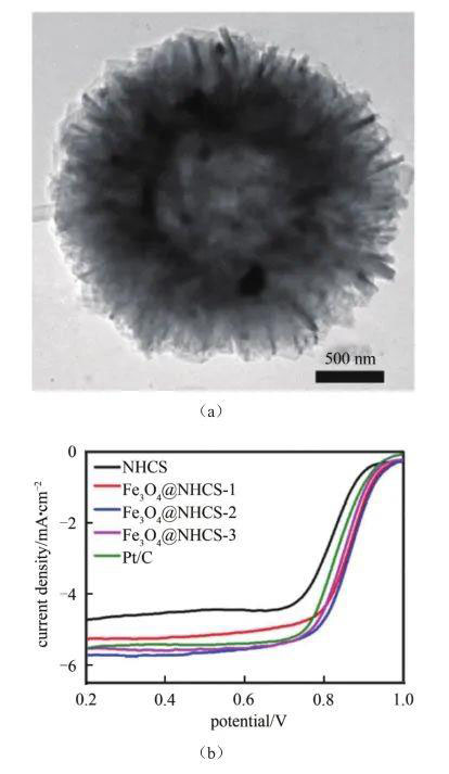 過渡金屬作為雙功能催化劑的研究與開發(fā)已經(jīng)有了很大的進展,然而由于金屬氧化物納米顆粒的低導電性和團聚性限制了其催化活性。研究發(fā)現(xiàn),通過構建納米結構、與碳材料復合或摻雜異質(zhì)原子等方法,可以改善過渡金屬氧化物比表面積小、導電性差和活性位點不足等問題。Cheng等通過水熱法在氮摻雜的碳材料(N-KC)上負載Co3O4納米顆粒,測試顯示半波電位為0.82 V,在0.1 mol/L KOH溶液中的極限電流密度為5.70 mA/cm2。由于Co3O4與N-KC的強耦合效應和氮元素摻雜的協(xié)同作用,所得到的Co3O4/N-KC納米復合材料具有顯著的催化活性。Li等以ZnO納米線為模板制備了Fe3O4與氮摻雜空心碳球復合催化劑(Fe3O4@NHCS)[圖4(a)],ORR半波電位和起始電位優(yōu)于商業(yè)Pt/C催化劑[圖4(b)]。作為鋅空氣電池陰極電催化劑時,功率密度和比容量分別為133 mW/cm2和701 mA·h/g,分析發(fā)現(xiàn)高比表面積組成的空心結構以及高活性納米顆粒與氮摻雜基體材料的協(xié)同作用是獲得高性能催化劑的主要原因。