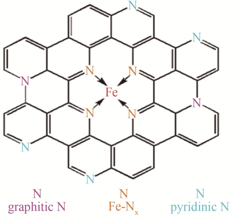 單原子催化劑(SACs)作為一種原子尺度的催化劑,具有極高的原子利用率、獨特的電子結構和優(yōu)異的電催化活性。MOFs因其獨特的三維有序多孔結構成為合成單原子催化劑的熱門材料。研究發(fā)現(xiàn),M-Nx-C (M=Fe,Co,Ni)基單原子結構催化劑對ORR/OER有著良好的電催化活性,其具有高度分散性和協(xié)同不飽和環(huán)境,金屬載體間的相互作用增強了電荷轉(zhuǎn)移效應,獨特的電子結構提高了對氧的吸附能力,從而促進四電子反應并提高了ORR的本征催化活性。Han等通過在ZIF-8生長過程中加入Fe-Phen配合物,經(jīng)過熱處理后成功合成原子分散的Fe-Nx-C結構,分析顯示該催化劑中存在吡啶N、Fe-Nx和石墨N共存(圖7)。所得的Fe-Nx-C催化劑ORR半波電位為0.91 V,高于商業(yè)Pt/C。作為鋅空氣電池的陰極催化劑時,電池在1.51 V的開路電壓和96.4 mW/cm2的功率密度下具有優(yōu)異的電化學性能。
