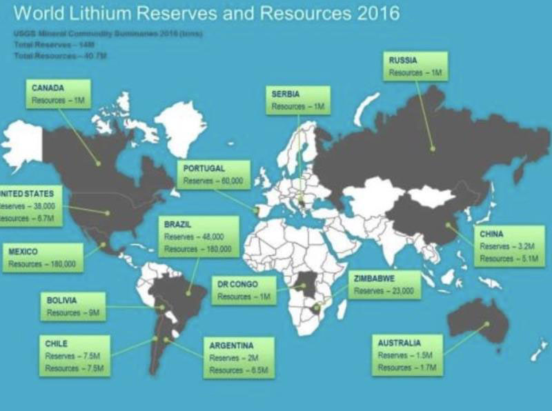 ■ 2016年全球主要國(guó)家鋰儲(chǔ)量、資源量分布圖
