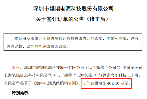 12月18日,雄韜股份發(fā)布公告,下屬子公司上海氫雄信息科技有限公司(下稱“上海氫雄”)與德先汽車科技(上海)有限公司簽署了《燃料電池系統(tǒng)購銷合同》。該合同訂單金額為3,461.50萬元。訂單標(biāo)的為52kW燃料電池系統(tǒng)及車載供氫系統(tǒng)。
