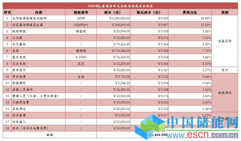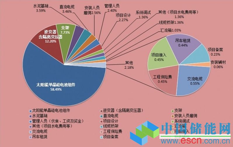 按照2013年年底西安地區(qū)某300kWp屋頂分布式光伏電站建設(shè)直接成本來(lái)分析,300kWp的項(xiàng)目總花費(fèi)為220萬(wàn)多元(該費(fèi)用實(shí)際成本費(fèi)用,不含EPC單位項(xiàng)目建設(shè)利潤(rùn)),其中組件占到58.49%,逆變器占到總成本的12.2%,支架占到總成本的7.73%。項(xiàng)目總造價(jià)每瓦成本約合7.3元??紤]系統(tǒng)集成公司利潤(rùn),對(duì)于常規(guī)屋頂電站項(xiàng)目市場(chǎng)報(bào)價(jià)按照8元每瓦較為合理。項(xiàng)目各項(xiàng)費(fèi)用支出及比例詳見(jiàn)上表及下圖所示。