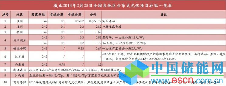截止2014年2月25日全國(guó)各地區(qū)分布式光伏項(xiàng)目補(bǔ)貼一覽表