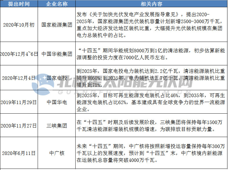 國(guó)家主席習(xí)近平12月12日在氣候雄心峰會(huì)上宣布到2030年,風(fēng)電、太陽(yáng)能發(fā)電總裝機(jī)容量將達(dá)到12億千瓦以上。國(guó)家能源局新能源司副司長(zhǎng)任育之不久前也曾預(yù)測(cè),今年年底光伏發(fā)電從規(guī)模上將超過(guò)風(fēng)電,成為全國(guó)第三大電源,十四五新增光伏裝機(jī)規(guī)模需求還將遠(yuǎn)高于十三五?;诖斯夥袠I(yè)、企業(yè)對(duì)于“十四五”光伏產(chǎn)業(yè)表現(xiàn)出極大的信心并加緊制定新的企業(yè)發(fā)展規(guī)劃,“五大四小”發(fā)電集團(tuán)同樣如此。
