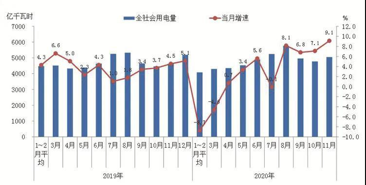 11月份,國家電網(wǎng)經(jīng)營區(qū)全社會(huì)用電量5050億千瓦時(shí),同比增長(zhǎng)9.1%,增速創(chuàng)近27個(gè)月新高,較去年同期上升4.6個(gè)百分點(diǎn)。