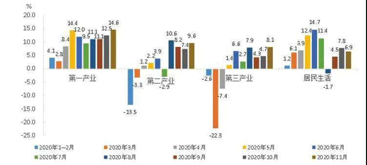 11月份,第一、二、三產(chǎn)業(yè)和居民生活用電量增速分別為14.6%、9.6%、8.1%、6.9%。其中,第一產(chǎn)業(yè)用電量連續(xù)4個(gè)月保持兩位數(shù)增長(zhǎng),增速創(chuàng)年內(nèi)新高;第二產(chǎn)業(yè)用電量增速連續(xù)4個(gè)月保持高位,對(duì)全社會(huì)用電量增長(zhǎng)貢獻(xiàn)率達(dá)到76.0%、連續(xù)4個(gè)月超過70%;第三產(chǎn)業(yè)用電量增速創(chuàng)年內(nèi)新高,累計(jì)增速由負(fù)轉(zhuǎn)正;居民生活用電量保持較快增長(zhǎng)。