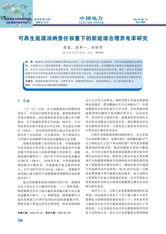 GAO Lei, SU Xinyi, LIU Shiyu. Study on reasonable curtailment rate of renewables under certain renewable energy consumption quota obligation[J]. Electric Power, 2020, 53(12): 136-142.