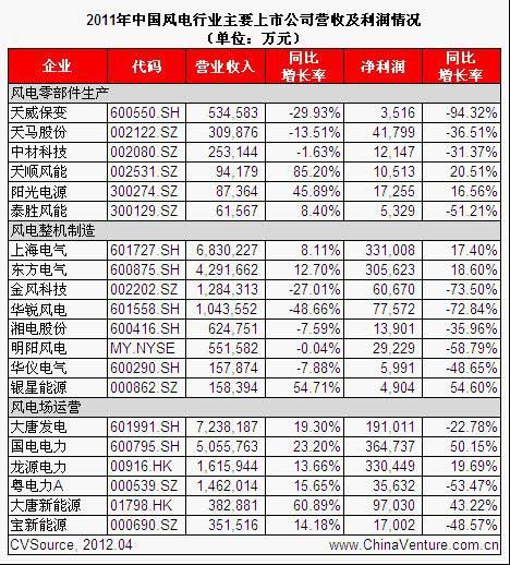 表1 2011年中國(guó)風(fēng)電行業(yè)主要上市公司營(yíng)收及利潤(rùn)情況