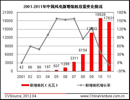 圖1 2001-2011年中國(guó)風(fēng)電新增裝機(jī)容量變化情況