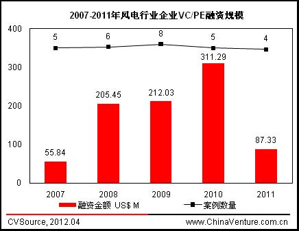 圖2 2007-2011年風(fēng)電行業(yè)企業(yè)VC/PE融資規(guī)模