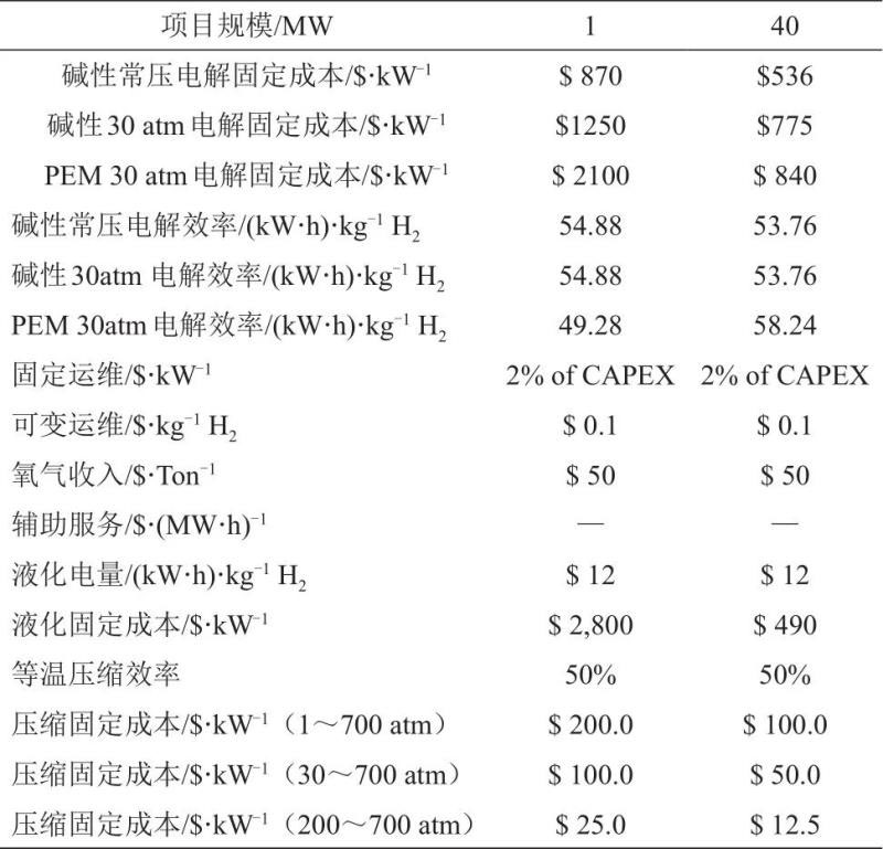 由于國(guó)內(nèi)仍無成熟的規(guī)?;疨EM電解技術(shù),為了便于比較,我們采用了國(guó)際知名公司電解裝置(如NEL、McPhy與GINER),以美元計(jì)價(jià)對(duì)電解制氫成本進(jìn)行分析。表2總結(jié)了不同評(píng)估工廠的技術(shù)成本和性能系數(shù),對(duì)30 atm,40 MW 的PEM電解裝置,由于缺乏官方報(bào)價(jià),固定成本支出是根據(jù)1 MW系統(tǒng)將容量擴(kuò)大到40 MW時(shí)的成本減少額(約60%)來確定的,就壓縮機(jī)而言,大型系統(tǒng)的固定成本支出假定為1 MW系統(tǒng)固定成本支出的50%。