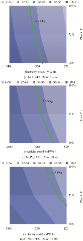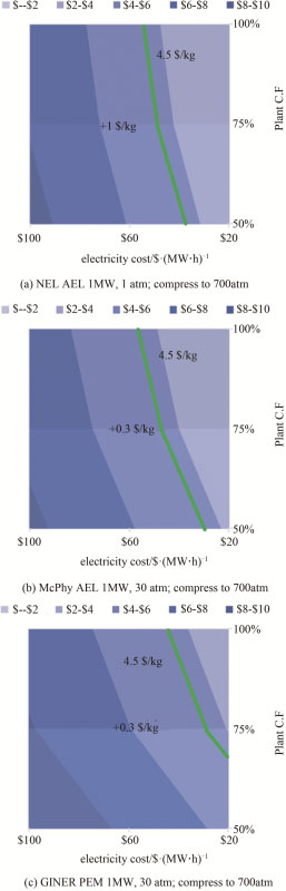 圖2是電解制氫LCOH成本受電力成本和產(chǎn)能因數(shù)的函數(shù)圖,3個(gè)不同的1 MW電解制氫裝置圖上都突出顯示了氫氣成本4.5 $/kg的目標(biāo)標(biāo)記。可以看出,隨著電解裝置的容量因數(shù)降低,為實(shí)現(xiàn)上述目標(biāo),電力成本需要更快下降,與采用的電解裝置類型關(guān)系不大。30 atm堿性電解裝置在75%的容量因數(shù)和60 $/MW·h的電力成本下氫氣的LCOH成本約4.5 $/kg,75%的容量因數(shù)和60 $/MW·h電價(jià)與實(shí)際電解廠運(yùn)行情況相近。值得一提的是4.5 $/kg是為高能量密度氫氣產(chǎn)品設(shè)定的,該成本必須考慮壓縮或液化的增量成本。