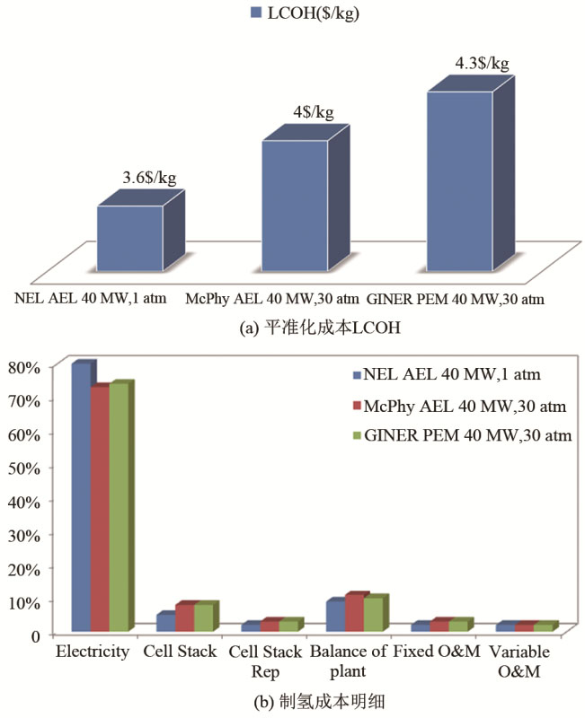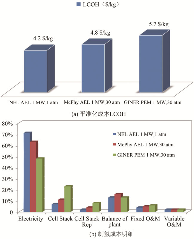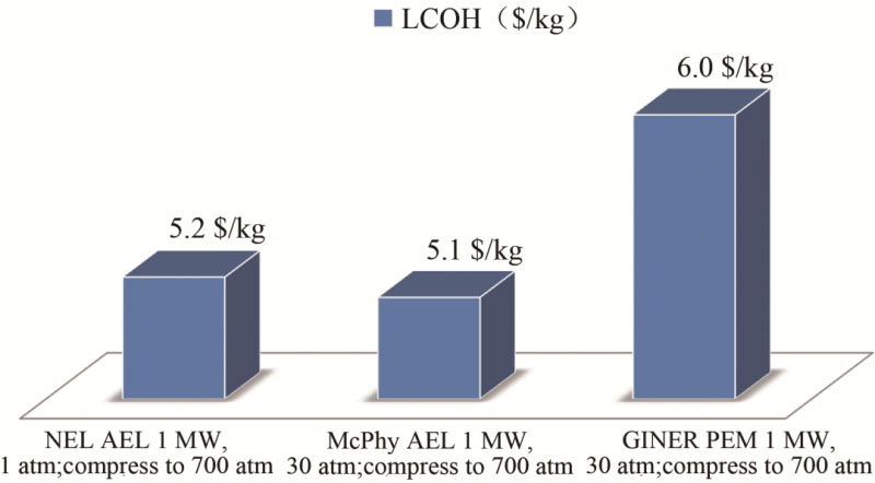 圖6 規(guī)模1MW電解制氫并壓縮至700 atm的平準(zhǔn)化成本LCOH比較
