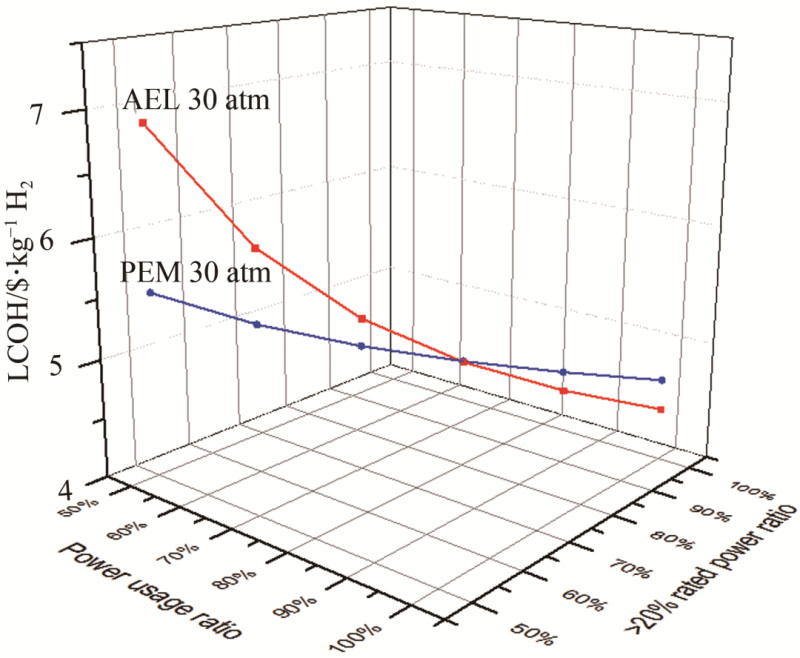高壓(30 atm) 34.3 MW AEL與26.8 MW PEM電解制氫平準(zhǔn)化成本LCOH隨可再生能源波動(dòng)性的敏感性變化如圖8所示,其中電價(jià)以60 $/(MW·h)計(jì)算,可再生能源波動(dòng)性以可再生能源利用率計(jì)算,同時(shí)考察了可再生能源中大于20%額定功率占比的影響。考慮到對(duì)堿性電解裝置小于20%額定功率部分的能量無法啟動(dòng)裝置,而該部分能量在PEM中可以得到利用,因此在分析可再生能源利用率的同時(shí)將功率波動(dòng)性分為了大于20%額定功率部分與小于20%額定功率波動(dòng)性兩部分,分析了大于20%額定功率部分占比對(duì)LCOH成本的影響??梢钥闯鲈?0 MW可再生能源100%功率供給時(shí),高壓34.3 MW堿性與26.8 MW PEM電解制氫的LCOH相近,PEM電解略高;隨著可再生能源利用率降低,二者的氫氣成本逐漸升高。由于可再生能源中低品質(zhì)部分(小于20%額定功率)的電能在AEL電解中無法利用(堿性可允許的負(fù)載區(qū)間為20%~120%),而在PEM電解中該部分能量是可以用于產(chǎn)氫的(PEM可允許的負(fù)載區(qū)間為0~150%),隨著可再生能源損失中大于20%額定功率部分的減少(或小于20%額定功率部分的增加),AEL的電解制氫成本較PEM的制氫成本有明顯的升高。當(dāng)可再生能源利用率為50%時(shí),其中大于20%額定功率部分占比為50%時(shí),PEM的LOCH成本為5.5 $/kg H2,而AEL的LOCH成本達(dá)到6.9 $/kg H2。