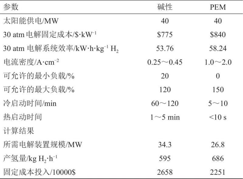 太陽(yáng)能每天需要冷啟停一次,而且由于陰天下雨等天氣影響,1個(gè)自然年太陽(yáng)能波動(dòng)供電中低于額定功率20%的電量占比可達(dá)20%以上,該部分能量低于堿性電解裝置要求的最小負(fù)載,無法使電解裝置啟動(dòng),而這部分能量在PEM電解中可以利用起來。PEM電解允許的最大負(fù)載為150%,而堿性電解裝置允許的最大負(fù)載為120%,40 MW太陽(yáng)能發(fā)電需要配套34.3 MW堿性電解裝置,如配套PEM電解裝置則僅需26.8 MW,PEM裝置規(guī)??擅黠@小于堿性裝置,固定成本投入方面PEM比堿性更有優(yōu)勢(shì)(表3)。由表3可知同樣是40 MW的太陽(yáng)能輸入26.8 MW的PEM電解裝置每小時(shí)可制備氫氣686 kg,或需要配置34.3 MW的堿性電解裝置每小時(shí)可制備氫氣595 kg。以上計(jì)算沒有考慮占地面積的影響,PEM裝置更加緊湊,同等規(guī)模下PEM占地面積幾乎為堿性裝置的一半,在土地昂貴的地區(qū)PEM電解優(yōu)勢(shì)將更加明顯。