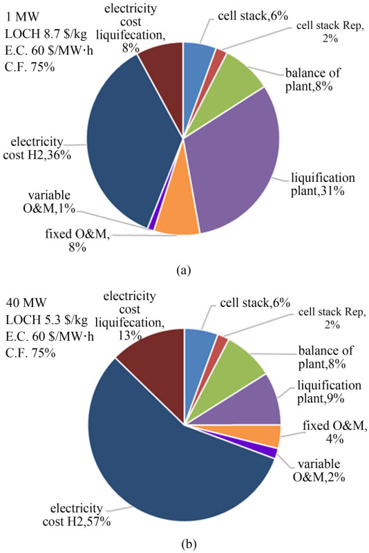 圖7 規(guī)模1 MW和40 MW堿性電解制氫(氫氣出口壓力30 atm)和液化成本{明細(xì)[產(chǎn)能因數(shù)為75%,電力成本為60 $/(MW·h)]}