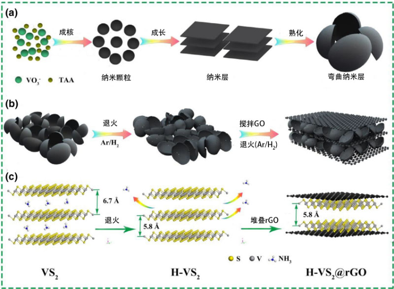 圖1 . (a)單分散碗狀VS2納米片的溶劑熱生長(zhǎng)過(guò)程示意圖;(b)H-VS2以及 H-VS2@rGO復(fù)合材料的形成;(c) 相應(yīng)結(jié)構(gòu)的示意結(jié)構(gòu)