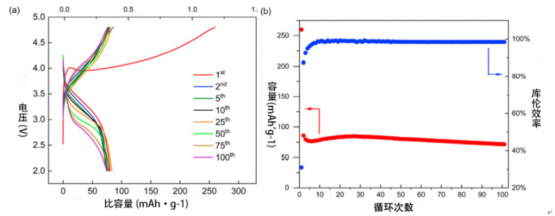 圖1. (a) 充放電性能 (b) 10 mAg-1 恒定電流循環(huán)100次后Li2Nb0.15Mn0.85O3材料的dQ/dV 圖像