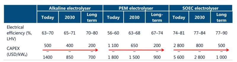 根據(jù)IEA的預(yù)測(cè),到2030年堿性電解水制氫的投資成本將由目前的500-1400 USD/kW 降低至400-850 USD/kW,降低幅度達(dá)到20%-40%,到2050年降低幅度達(dá)到50%-60%。