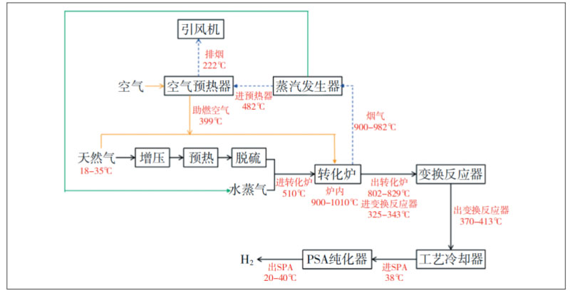 利用化石燃料制氫有部分氧化和氣化兩種技術(shù)路徑,部分氧化是指燃料不完全燃燒而產(chǎn)生合成氣,可用燃料范圍廣,不需要外部熱量輸入,反應(yīng)速度快,但氫氣產(chǎn)量低。氣化是煤在高溫高壓下部分燃燒生產(chǎn) 合成氣的過程,反應(yīng)速度快,但固體燃料需要預(yù)處理。天然氣重整制氫包括轉(zhuǎn)化反應(yīng)和變換反應(yīng),制得的氫氣純度高,工藝流程如圖2所示。首先對天然氣進(jìn)行預(yù)處理,包括增壓、預(yù)熱和脫硫等環(huán)節(jié);然后與蒸汽按一定比例混合,在轉(zhuǎn)化爐中先進(jìn)入混合氣預(yù)熱盤管,預(yù)熱到550℃~600℃,再進(jìn)入轉(zhuǎn)化管,在催化劑層中,進(jìn)行轉(zhuǎn)化反應(yīng)CH4+H2O→CO+3H2,ΔH=206.1kJ/mol,反應(yīng)壓力約2.5MPa,溫度約850℃;余熱回收后,在變換反應(yīng)器中進(jìn)行變換反應(yīng)CO+H2O→CO2+H2,ΔH=-41.2kJ/mol,反應(yīng)壓力約 2.5MPa,溫度約350℃;變換反應(yīng)出來的氣體經(jīng)工藝 冷卻器冷卻后進(jìn)入裝有多種吸附劑的PAS純化器中進(jìn) 行氫氣提純,CO、CO2等被吸附;最后通過壓縮機(jī)加壓、充裝并儲存。轉(zhuǎn)化爐產(chǎn)生的廢氣進(jìn)入蒸汽發(fā)生 器,生產(chǎn)轉(zhuǎn)化反應(yīng)用蒸汽;廢氣再從蒸汽發(fā)生器進(jìn)入空氣預(yù)熱器,預(yù)熱助燃空氣,用于維持轉(zhuǎn)化爐的燃燒 反應(yīng)溫度;最后廢氣經(jīng)引風(fēng)機(jī)排至大氣。
