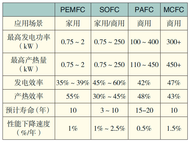 氫能用于建筑供熱的方式包括氫氣鍋爐和FC熱電聯(lián)供(fuel cell-combined heat and power,F(xiàn)CCHP)系統(tǒng)等。現(xiàn)有燃?xì)忮仩t只允許摻混少量氫氣,若使用純氫作為燃料,需對裝置結(jié)構(gòu)進(jìn)行大規(guī)模改造。FC-CHP系統(tǒng)噪音小、排放少、效率高,是唯一超過全電系統(tǒng)運(yùn)行效率的CHP系統(tǒng),并且由于其 電熱比很高,非常適用于熱負(fù)荷低的建筑。各類FCCHP性能參數(shù)見表2,其中,質(zhì)子交換膜燃料電池 (proton exchange membrane fuel cells,PEMFCs)主要 用于民用供暖系統(tǒng),磷酸燃料電池(phosphoric acid fuel cells,PAFCs)和熔融碳酸鹽燃料電池(molten carbonate fuel cells,MCFCs)主要用于大型商用供暖系統(tǒng),固體氧化物燃料電池(solid oxide fuel cells,SOFCs)在民用和商用系統(tǒng)中均可使用。目前FCCHP價格較高,每kW發(fā)電量價格在1萬美元左右,但在過去10年內(nèi),價格已降低了一半左右,且使用壽命也有所增加,預(yù)計在2025年~2050年價格降至與其他 供熱系統(tǒng)相近水平。