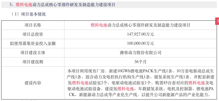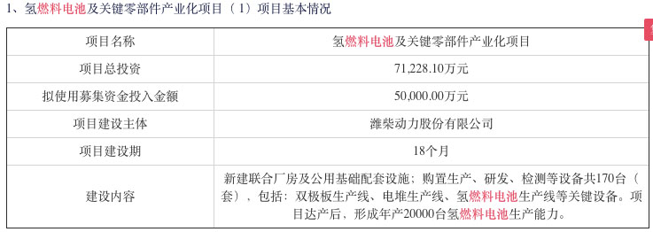 在本次公告中,濰柴動力詳細披露了燃料電池產(chǎn)業(yè)鏈建設項目的基本情況。其中,氫燃料電池及關鍵零部件產(chǎn)業(yè)化項目基本情況如下: