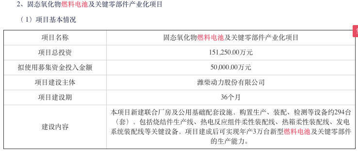 其中燃料電池產(chǎn)業(yè)鏈建設項目有:氫燃料電池及關鍵零部件產(chǎn)業(yè)化項目,總投資7.12億元,擬使用募集資金5億元;固態(tài)氧化物燃料電池及關鍵零部件產(chǎn)業(yè)化項目,總投資15.13億元,擬使用募集資金5億元;燃料電池動力總成核心零部件研發(fā)及制造能力建設項目,總投資14.79億元,擬使用募集資金10億元。