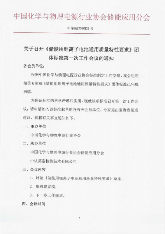 關(guān)于召開《儲能用鋰離子電池通用質(zhì)量特性要求》團體標準第一次工作會議的通知