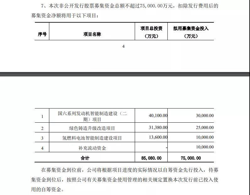 中國儲能網(wǎng)訊:近日,全柴動力發(fā)布公告,正式對外披露發(fā)公開發(fā)行股票預(yù)案。公司擬向控股股東安徽全柴集團有限公司在內(nèi)的不超過35名特定對象定增1.11億股,募資資金總額不超過7.5億元,投向國六系列發(fā)動機智能制造建設(shè) (二期)項目、綠色鑄造升級改造項目、氫燃料電池智能制造建設(shè)項目,及補充流動資金。上述項目總投資額8.51億元,擬使用募投資金7.5億元。