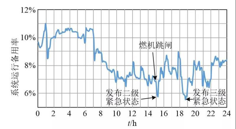 引發(fā)CAISO實施輪流停電的直接原因是系統(tǒng)供需不平衡,運行備用容量不滿足相關要求。CAISO對系統(tǒng)運行備用容量的要求遵循NERC標準BAL-002-3和WECC標準BAL-002-WECC-2a,最小的備用容量大約是負荷的6%。用于維持該要求的運行備用主要包括機組旋轉(zhuǎn)備用,以及可在10min內(nèi)啟動的機組和可切負荷等非旋轉(zhuǎn)備用。圖2給出了8月14日加州電力系統(tǒng)運行備用曲線。