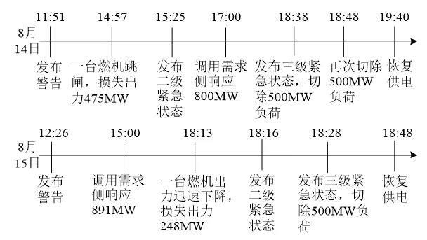 8月14日下午14:57,一臺燃氣機組因故障跳閘,損失出力為475MW。下午15:25,CAISO預測未來幾個小時將出現(xiàn)電力短缺,難以維持規(guī)定的備用容量要求,宣布進入二級緊急狀態(tài)。下午17:00,CAISO調(diào)用約800MW需求側(cè)響應資源以維持電力供需平衡。下午18:38,隨著傍晚光伏出力下降,系統(tǒng)無法滿足負荷需求和備用容量要求,CAISO宣布進入三級緊急狀態(tài),切除500MW負荷。10min后,再次切除500MW負荷。下午19:40,發(fā)電側(cè)資源可滿足負荷需求和備用要求,CAISO命令恢復所有的負荷。