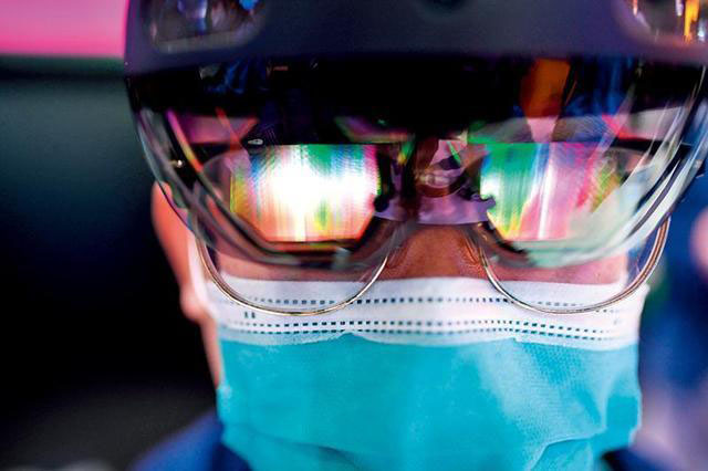 11月6日,一名工作人員在第三屆進(jìn)博會(huì)技術(shù)裝備展區(qū)微軟展臺(tái)演示操作 HoloLens2眼鏡 李任滋攝/本刊