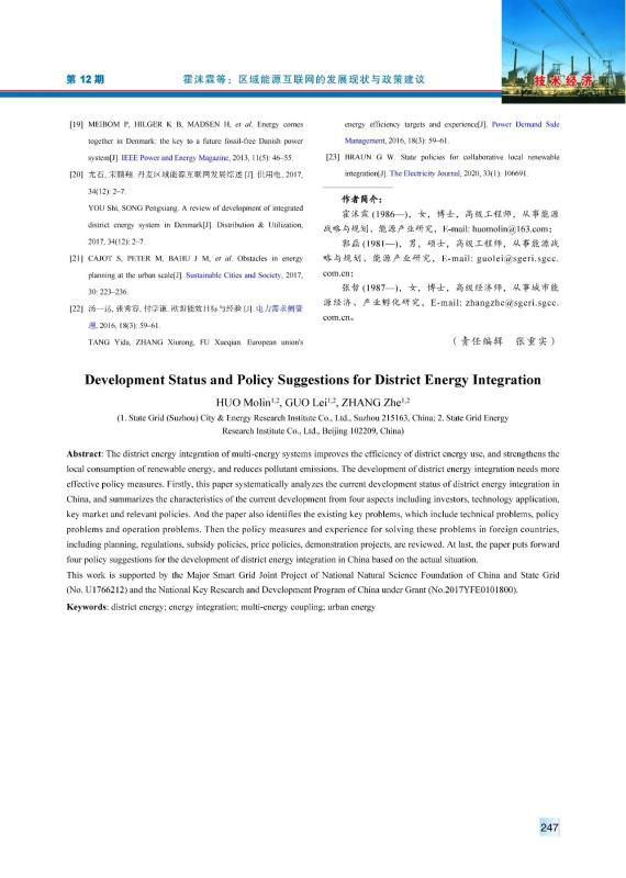 HUO Molin, GUO Lei, ZHANG Zhe. Development status and policy suggestions for district energy integration[J]. Electric Power, 2020, 53(12): 241-247.