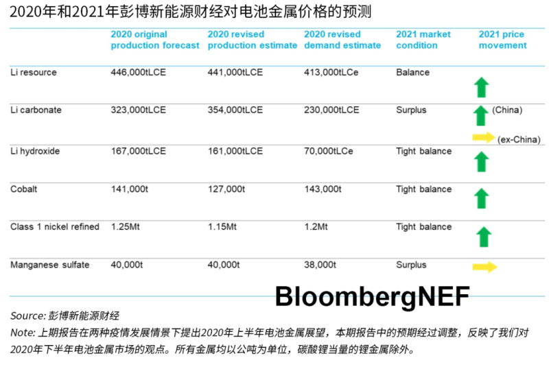 中國(guó)儲(chǔ)能網(wǎng)訊:歐洲新能源汽車(chē)市場(chǎng)的強(qiáng)勁增長(zhǎng)勢(shì)頭帶動(dòng)下,電池需求有所復(fù)蘇。本報(bào)告中,彭博新能源財(cái)經(jīng)調(diào)整了對(duì)主要電池金屬市場(chǎng)的供需預(yù)測(cè),對(duì)儲(chǔ)能需求提出了新的觀點(diǎn)。鋰、鈷、鎳和錳礦生產(chǎn)受疫情的影響已基本消散,目前逐步復(fù)工復(fù)產(chǎn)。