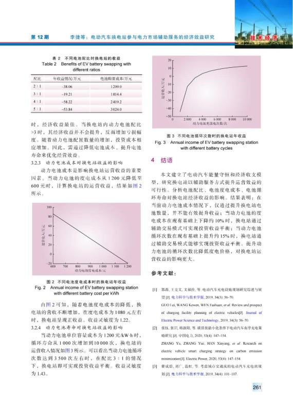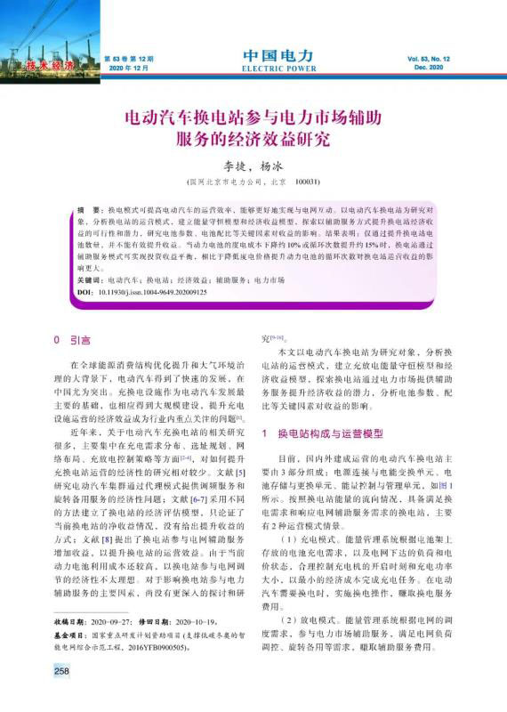 LI Jie, YANG Bing. Study on economic benefits of electric vehicle battery swapping station participating in power market auxiliary service[J]. Electric Power, 2020, 53(12): 258-262, 269.