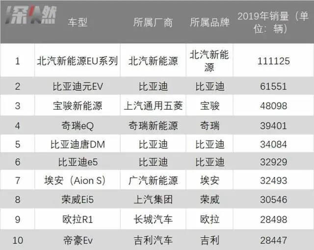 2019年,榜上有名的車型,如北汽EU系列、比亞迪e5、榮威Ei5、帝豪EV,到了2020年,銷量紛紛垮掉。2019年全年銷量(11萬輛)排名第一的北汽EU系列,在2020年掉出前十。