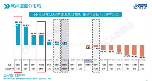 從乘聯(lián)會2020年1-11月份的銷量榜單看,在慘烈的退坡補貼政策中存活下來、快速增長的,有兩大類車型,分別是B級純電動車,以及A00級純電動車。