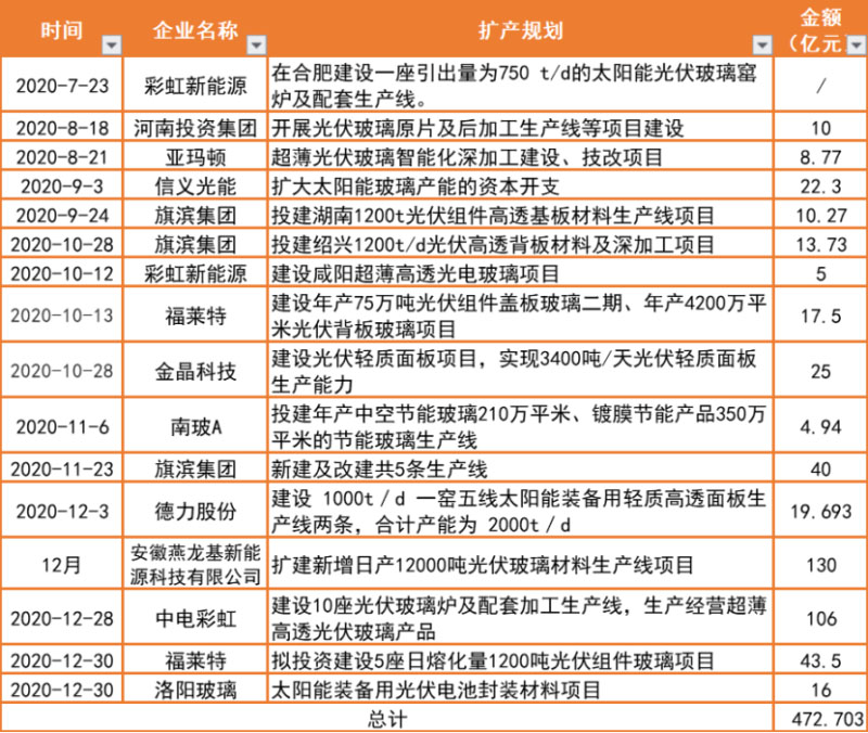 近日,中電彩虹、福萊特、洛陽玻璃三家玻璃巨頭相繼拋出了自己的擴(kuò)產(chǎn)計劃。短短四天時間,三家巨頭超過165億元的資本注入光伏玻璃產(chǎn)能之上。