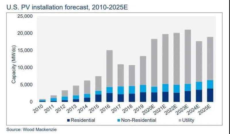 圖片:2021年美國新增光伏裝機(jī)將首次突破20GW。來源:Wood Mackenzie