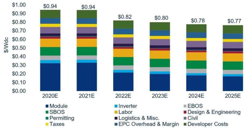 此外,從2019年到2020年,由于光伏組件價(jià)格持續(xù)壓低系統(tǒng)成本,光伏系統(tǒng)的所有細(xì)分市場的成本都有所下降。雖然2020年下半年玻璃等輔材漲價(jià)導(dǎo)致組件價(jià)格上漲,但是總趨勢還是同比下降的。根據(jù)Wood Mackenzie最近發(fā)布的《美國太陽能光伏系統(tǒng)價(jià)格報(bào)告》,2020年100 MW公用設(shè)施規(guī)模的光伏系統(tǒng)平均成本為0.94美元/W,到2025年可能下降19%(所有數(shù)據(jù)均為直流側(cè))。尤其是2021至2022年,單瓦成本將下降13%。主要原因在于201關(guān)稅將逐步取消。