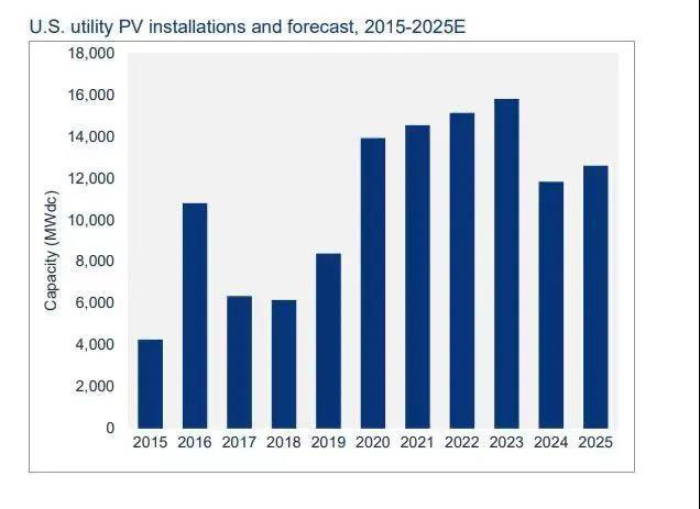 圖片:2020年美國公共事業(yè)規(guī)模光伏裝機(jī)容量在14GW左右。來源:Wood Mackenzie
