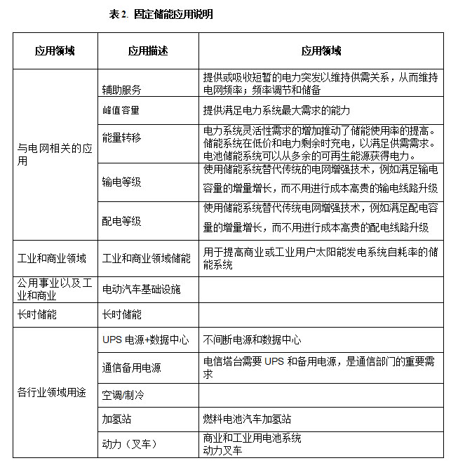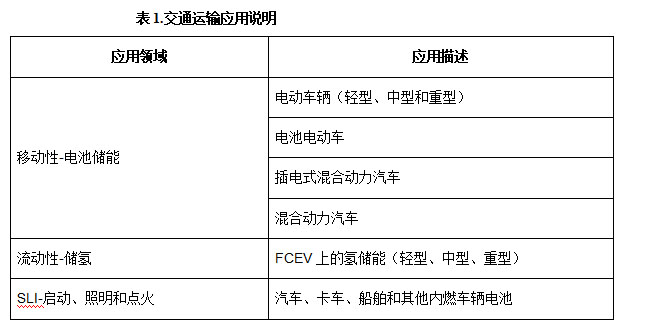 本報告涵蓋的兩個主要市場是固定儲能市場和義能運(yùn)輸市場,每個市場又細(xì)分為各自的領(lǐng)域。 運(yùn)輸有兩個主要領(lǐng)域:電動汽車(xEV)或燃料電池電動汽車(FCEV)的機(jī)動性,以及燃油汽車起動、照明和點(diǎn)火(SLI)。 表1中進(jìn)一步描述了與每個部門相關(guān)的應(yīng)用。表2中描述了固定儲能市場,其中大部分與電網(wǎng)和商業(yè)彈性相關(guān)。