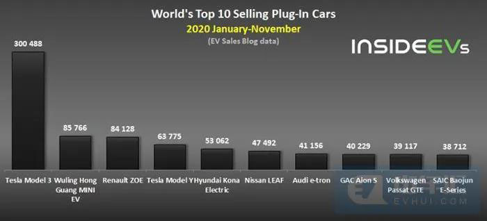 2020年截止到11月全球有超過三分之二的電動(dòng)汽車是純電動(dòng)車型,銷量大約是28.9萬(wàn)輛,同比增長(zhǎng)125%,市場(chǎng)份額約占4.1%。