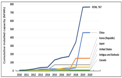 圖42. 氧化還原液流電池的全球各地部署情況(2010~2020年)