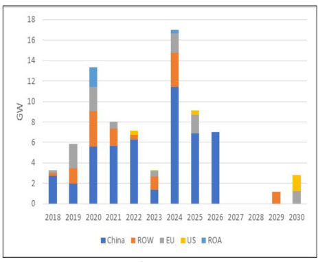 中國近期計劃部署的抽水蓄能設施裝機容量最高。從2020年至2026年,預計中國將部署35GW以上的抽水蓄能設施,都是規(guī)模非常大的水電站。例如,中國計劃年投資28億美元建設的豐寧縣水電站的裝機容量為3.5GW。而在澳大利亞,Genex 電力公司最近與Energy Australia公司簽定了一個裝機容量250MW抽水蓄能設施合同。