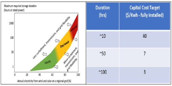 隨著儲能時間的增加,儲能系統(tǒng)的邊際價值下降,因此可負擔的總成本也將下降。因此,長時儲能技術的競爭力將取決于所需的持續(xù)放電時間。其總資本在此定義為安裝的成本,其中包括設備和工廠的全部成本。